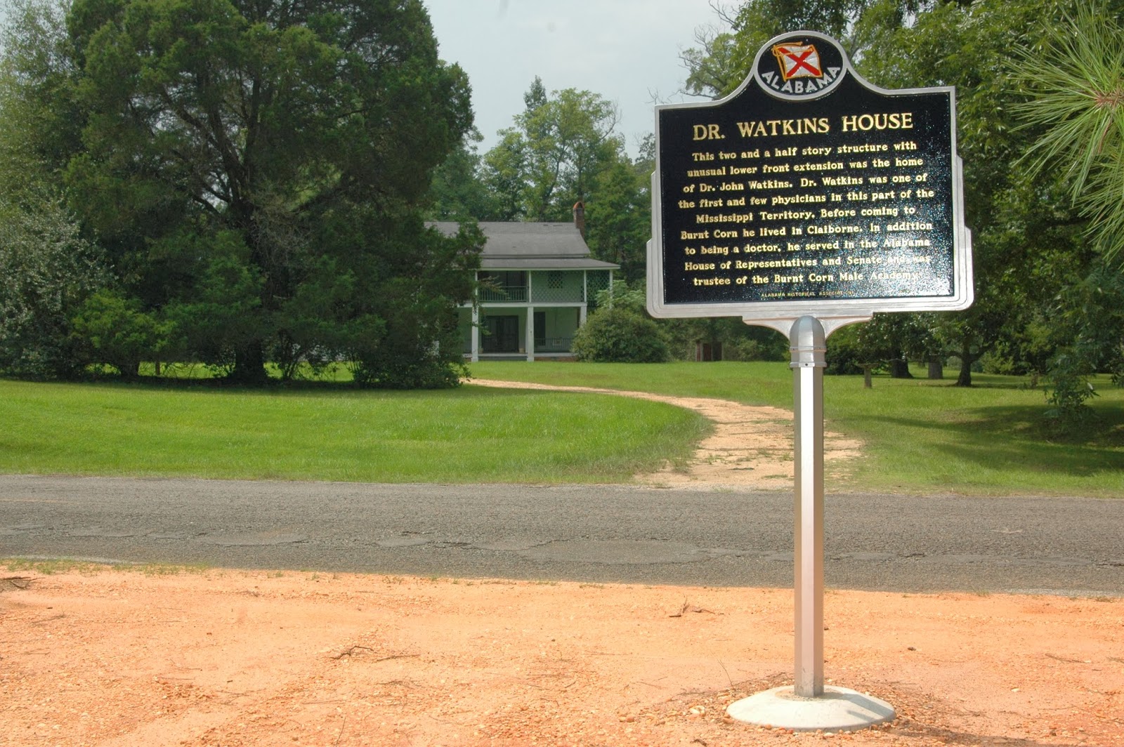 Dr. John Watkins lived in Burnt Corn in this house and it is still standing today. There a historic plaque on the house. There is a drawing of the Watkins HouseDR. JOHN WATKINS was a distinguished physician, who moved at quite an early period, to Conecuh, where he found himself almost alone, for some time, in his practice. Dr. Watkins was born within a short distance of the scene of General Lee's surrender at Appomattox Court House, Virginia, in 1775. Having received a liberal education, he pursued his medical studies in Philadelphia, whence he was graduated in 1804. He first located at Abbeville Court House, South Carolina, where he practiced in the family of Senator John C. Calhoun. He moved to Alabama in 1813, and located first on the Tombigbee river. Later we find him at Claiborne - the only physician between the Alabama and Chattahoochee rivers. Notwithstanding his decided usefulness in his chosen profession, he was urged to represent Monroe in the Constitutional Convention in 1819, and during the same year was elected to the Senate from the same county. At quite an early period after the settlement of Conecuh, he moved to Conecuh county, where his ability was speedily recognized as a physician. But here again he was destined to share in political honors, in 1828 he was sent to the Senate from Conecuh and Butler. Several years afterward he was chosen to represent Conecuh in the lower branch of the Legislature. In 1842 his services were again demanded in the realm of politics, and he was chosen Senator from Conecuh and Monroe counties. His devotion to his chosen profession, however, continued unabated, and he was assiduous in the accumulation of scientific works, that he might be the more fully prepared to meet the advancing demands of medicine. Dr. Watkins died at his home, near Burnt Corn, in 1854. He was a man of extraordinary physical powers. In manners he was exceedingly plain, and oftentimes very blunt. The following characteristic anecdote is related of him: He had a patient who had for a long time suffered from extreme nervousness. Dr. Watkins having learned that she had a peculiar fondness for coffee, admonished her to discontinue its use. Having been called to visit her again, he found her with her head resting upon her palms, and leaning over the fire-place, where he spied the coffee pot, poised upon a pedestal of glowing coals. Without ceremony, he knocked it from its position, causing the contents to flow out, and then proceeded to kick it across the room, through the door, and into the yard. But he was universally esteemed for his benevolence and hospitality. His memory will ever be cherished in Conecuh, because of his superior public worth.
