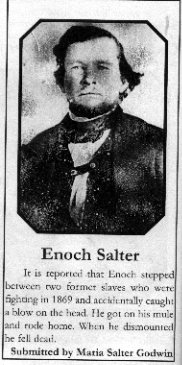It is reported that Enoch Salter stepped between two former slaves who were fighting in 1869 and accidentally caught a blow on his head. He got on his mule and rode home. When he dismounted he fell died.