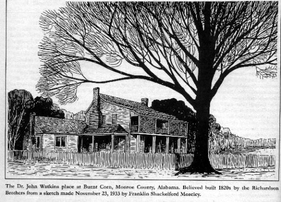 The Dr. John Watkins place at Burnt Corn, Monroe County, Alabama. Believed built 1820s by the Richardson Brothers. This from a sketch made on November 23, 1933 by Franlin Shackelford Mosley